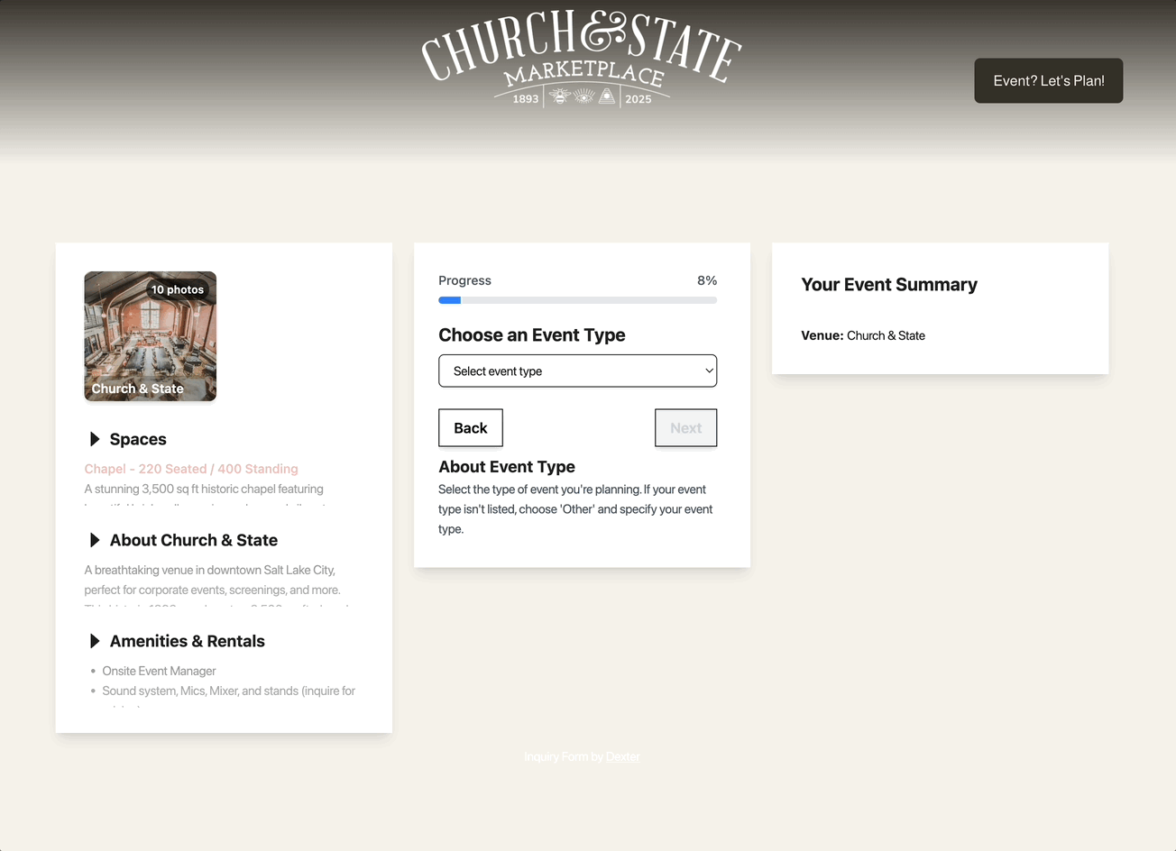 Church & State is a 4,000-square-foot event space in Utah run by Samantha, a one-woman show, who balances multiple ventures. Her generic forms and info@ email weren’t cutting it, and she was looking for a smarter way to streamline bookings and grow her business.